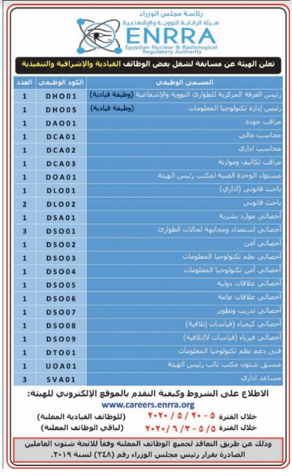 اعلان وظائف هيئة الرقابة النووية والاشعاعية والتقديم الكترونى حتى 3 6 2020