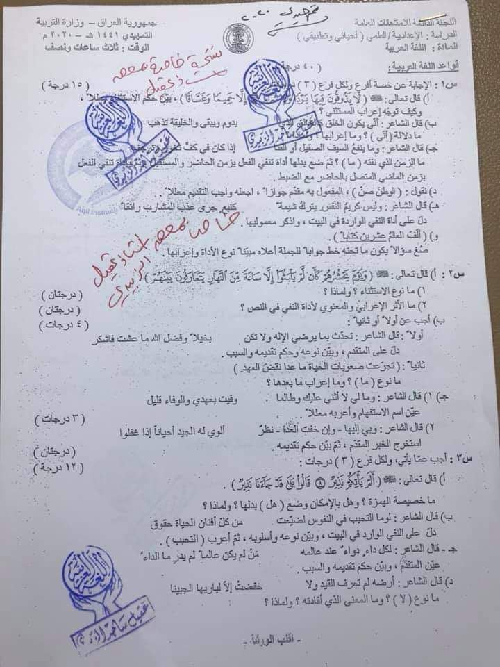 الاجوبة النموذجية عربي سادس علمي التمهيدي 2020 كنترول تصحيح الوزاري خارجي
