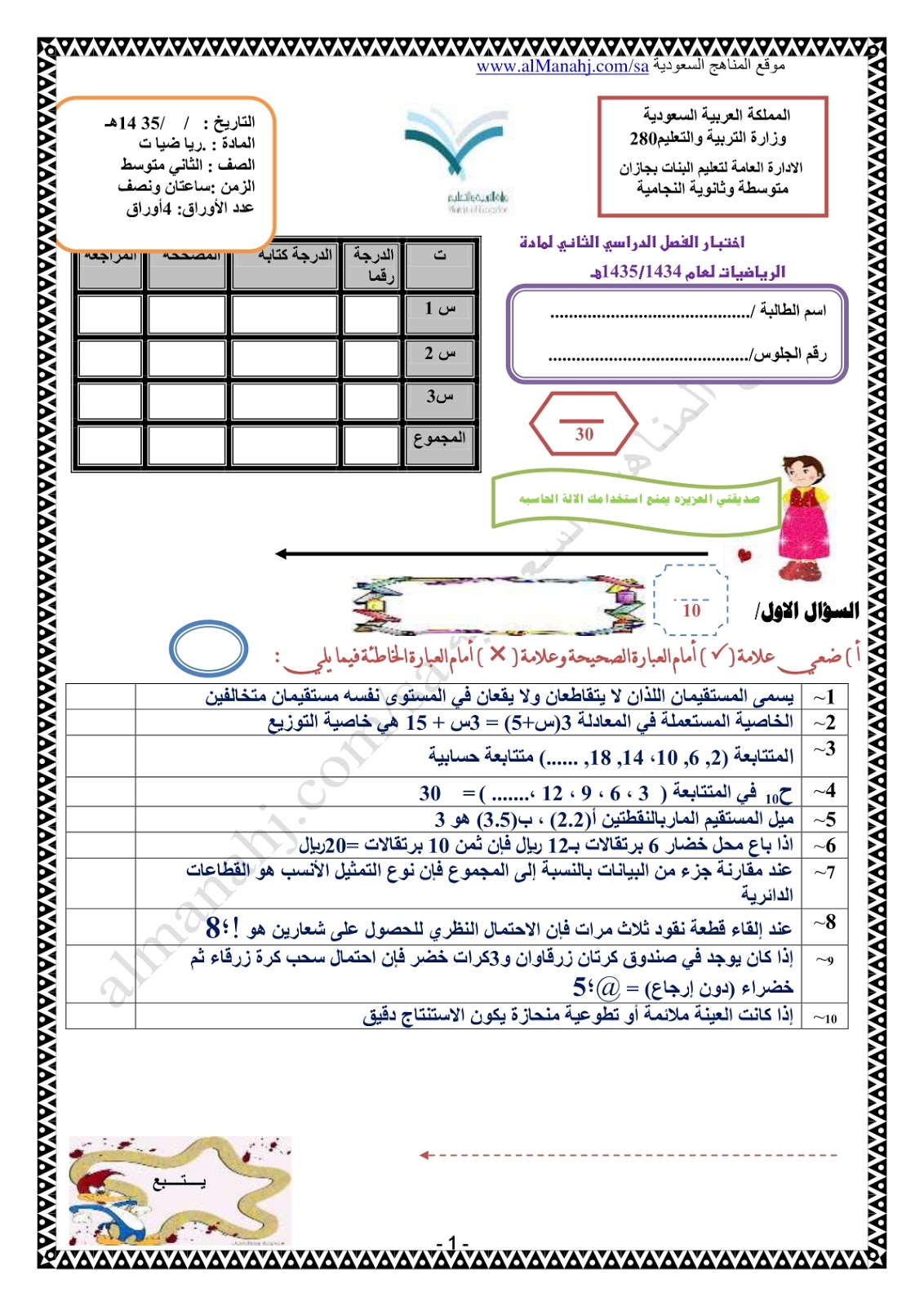 اختبار رياضيات 1435 الصف الثاني المتوسط رياضيات الفصل الثاني المناهج السعودية