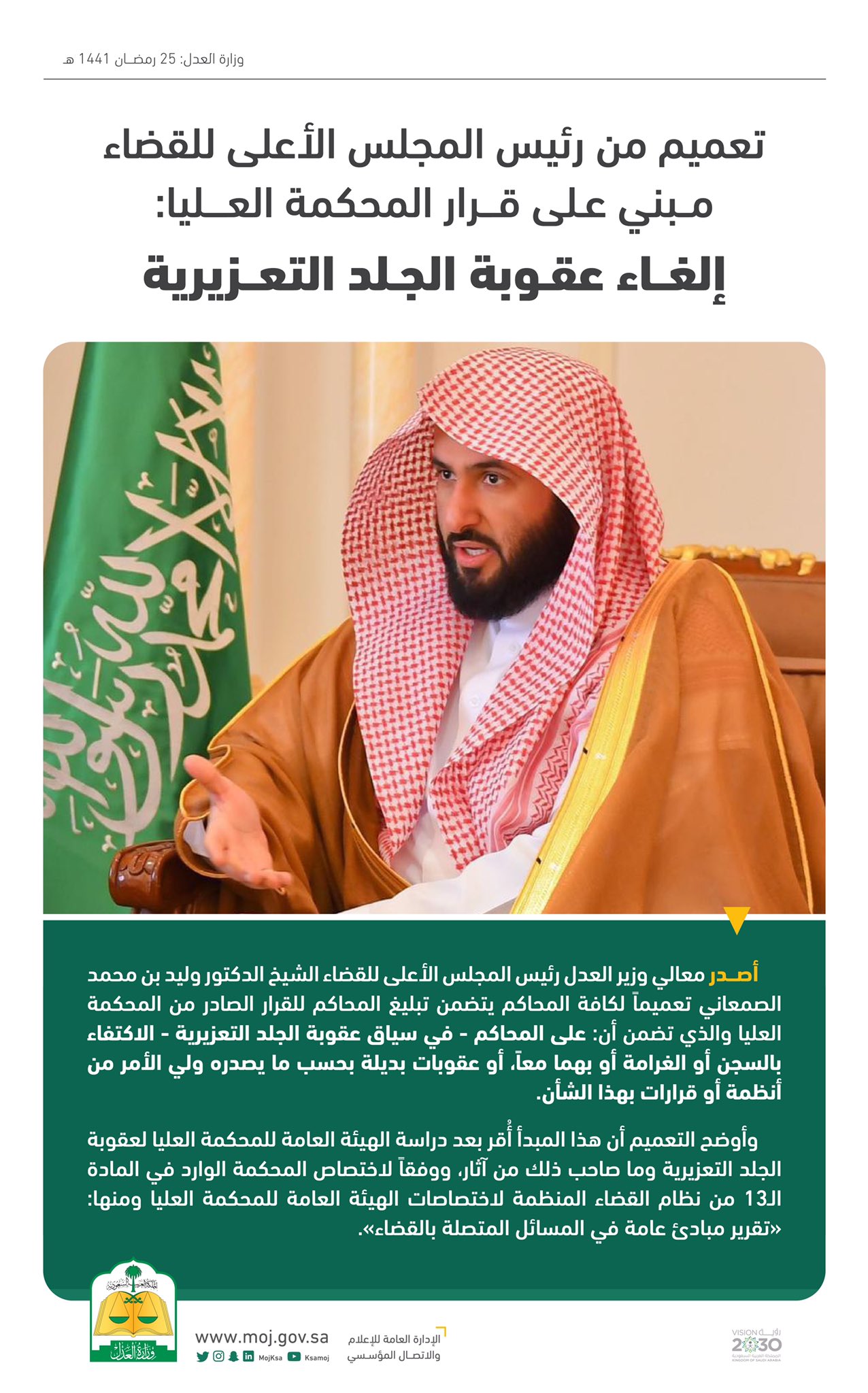 وزارة العدل على تويتر تعميم من رئيس المجلس الأعلى للقضاء مبني على قرار المحكمة العليا إلغاء عقوبة الجلد التعزيرية