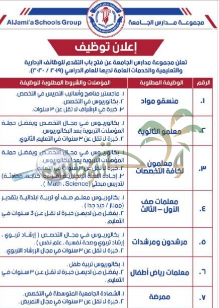 تعلن مدارس الجامعة عن فتح باب التقديم للوظائف الادارية والتعليمية والخدمات العامة للعام الدراسي 2019 2020