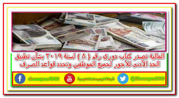 المالية تصدر كتاب دوري رقم ۸ لسنة ۲۰۱۹ بشأن تطبيق الحد الأدنى للأجور لجميع الموظفين وتحدد قواعد الصرف
